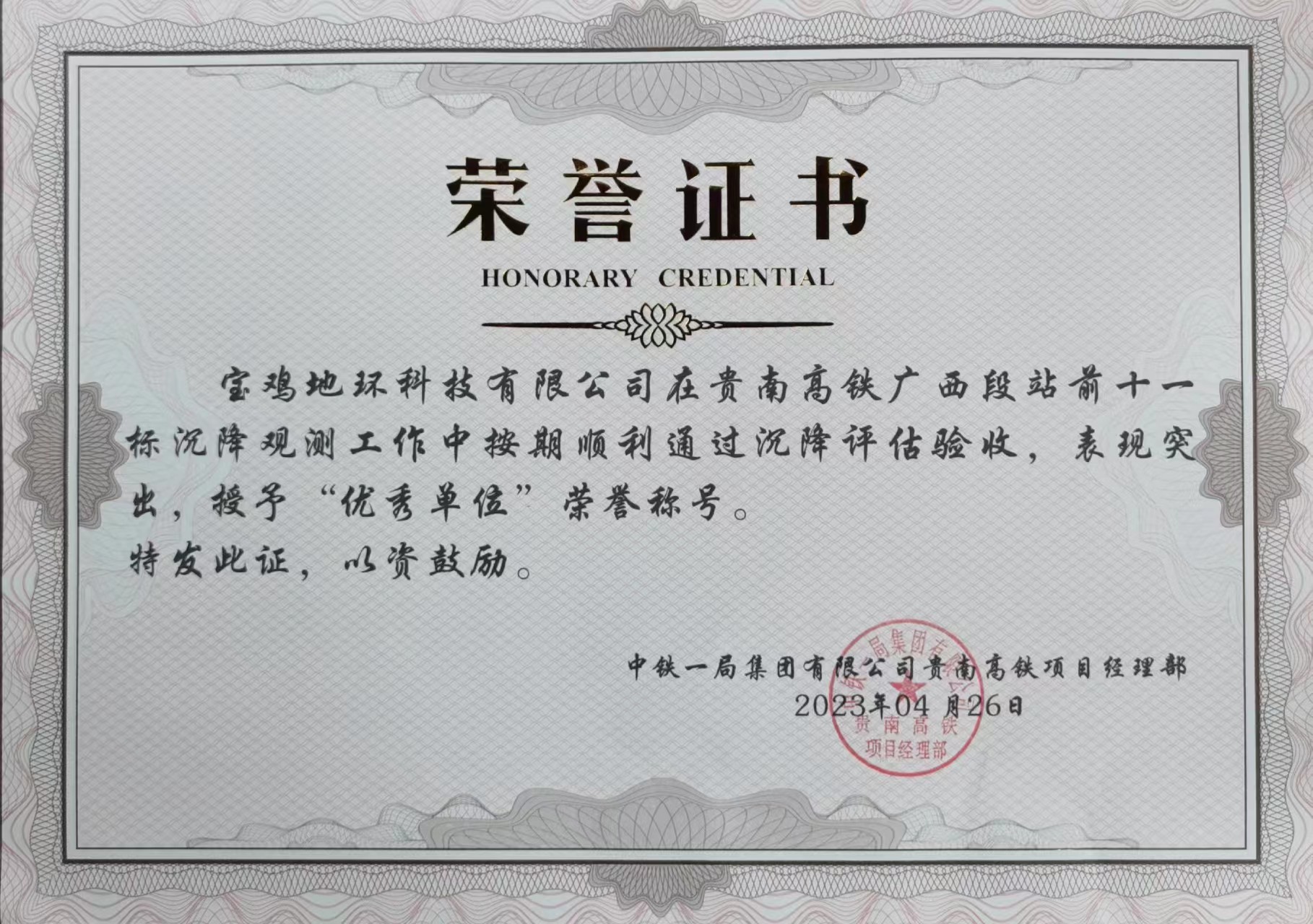 寶雞地環(huán)測繪人努力拼搏的精神,受到了中鐵一局集團有限公司貴南高鐵項目經(jīng)理部領(lǐng)導(dǎo)的高度贊揚和肯定。