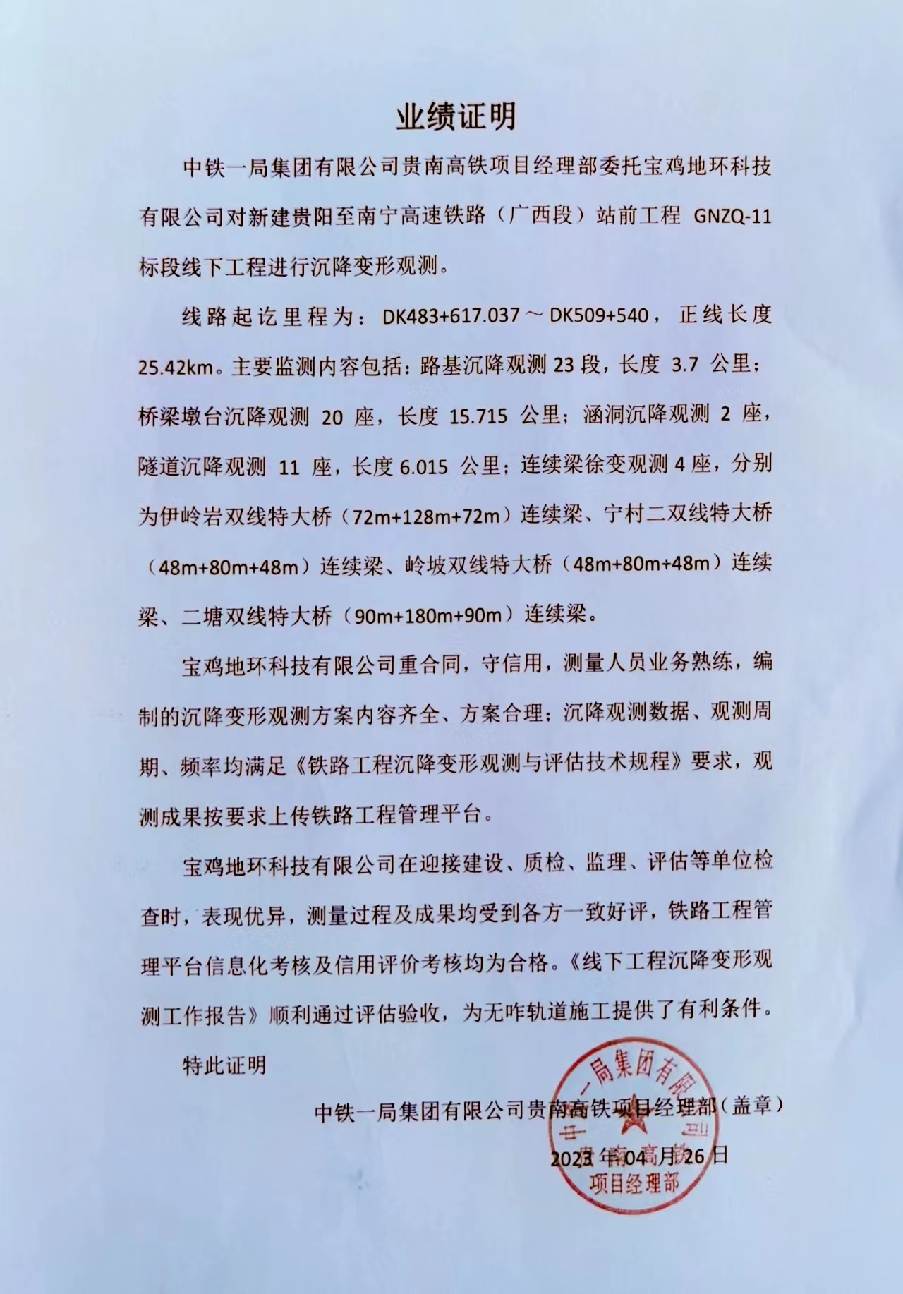中鐵一局集團有限公司貴南高鐵項目經(jīng)理部委托寶雞地環(huán)科技有限公司對新建貴陽至南寧高速鐵路 (廣西段)站前工程 GNZQ-11標段線下工程進行沉降變形觀測。
